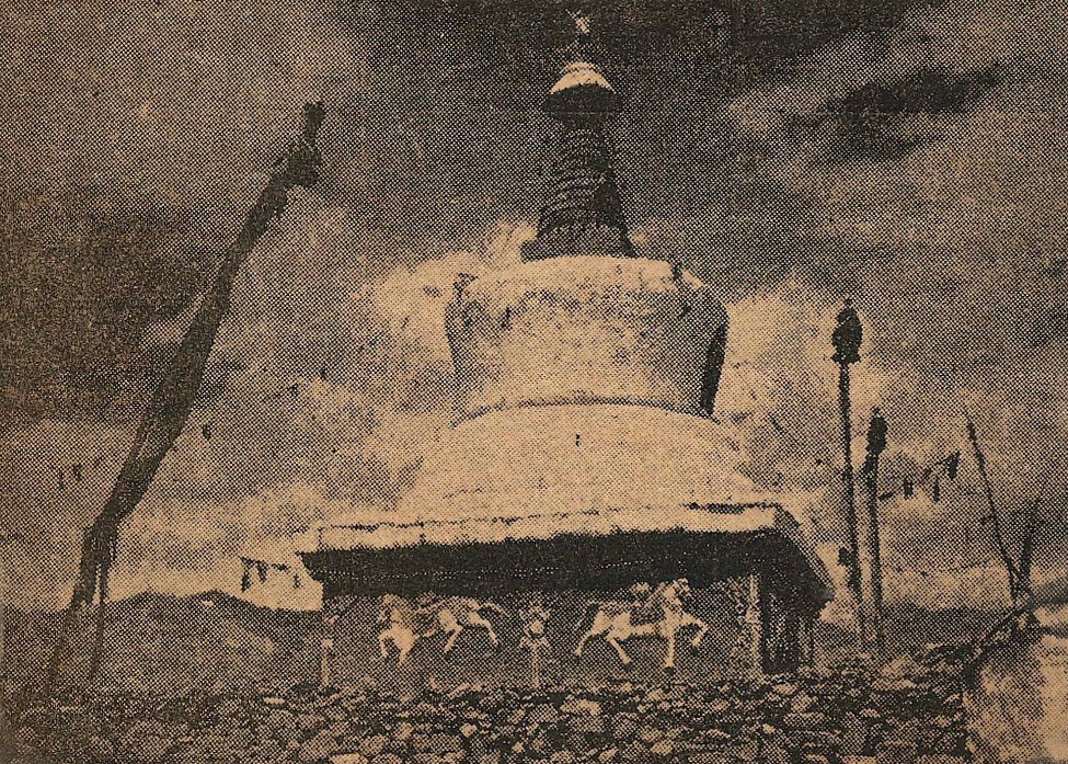 Driving further down the valley, I spied another gompa high up on a ridge. It looked splendid in its loneliness. But as we turned the corner and came around to the other side, a fantastic sight met our eyes. The monastery of Thikse covers a whole mountain slope. The cells of the monks sweep up the slope in serrated ranks till the eye catches the white painted main shrine with its prayer flags and golden flag poles. We simply stood and gazed in awe at this magnificent sight – the autumn golds of the valley with the white peasant’s cottages, the gompa on the hillside and the snows behind. The whole magic scene was heightened by the singing of the peasants at their harvest and by the music that floated down from the monastery as the monks sat at prayer. My guide told me that long ago the then Prime Minister, Mr. Jawaharlal Nehru, had come once and sat a long Iong time simply contemplating this remarkable scene. We did the same. It seemed a long way indeed from Chandigarh.